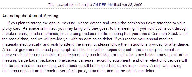 To attend you have to be a stockholder and register to attend. Here is the sheet with all of the information you need to fill out and submit in advance. Shown in the graphic box is what you receive back. Note that cameras are not permitted.